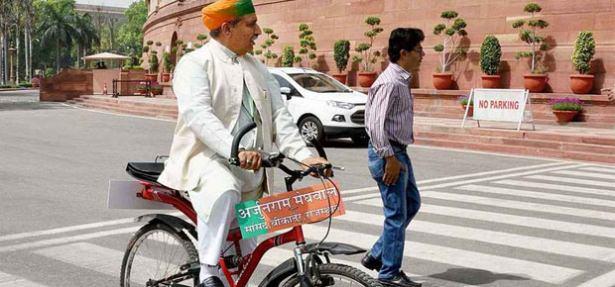 Meghwall bisikletinin ön kısmında Hint parlementosundaki görevini yazan bir kart taşıyor. Kırmızı siyah renktekiHerkül bisikletini Yeni Delhi parlamentosunun parkına koyarken, “Ben Başbakanın karbon emisyonunun azaltılması çağrısına katkıda bulunuyorum” diyor.