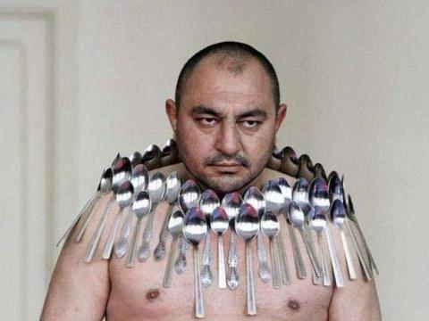 Etibar Elchiyev 50 metal kaşığı manyetize olarak vücudunda tutabiliyor.