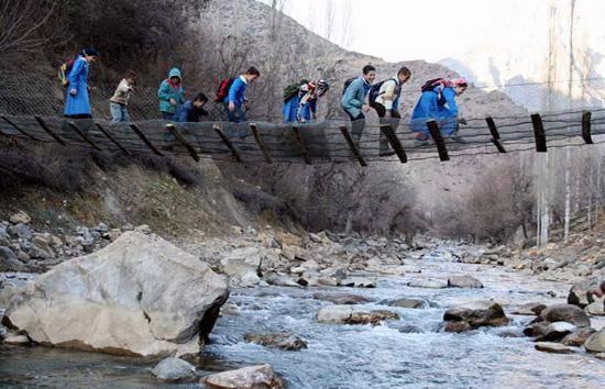 Batman'ın Kozluk İlçesine bağlı Yenidoğan köyü'nden 2007 yılında çekilmiş bir fotoğraf. Öğrenciler, Garzan Çayı üzerinde bulunan halat ve tahtalardan yapılmış 20 metre uzunluğunda 5 metre yüksekliğinden köprüyü aşarak okula gidiyor.