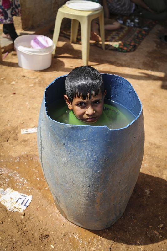 Suriyeli çocukları dereden doldukları bidonların içine girerek serinleme çalışıyor.