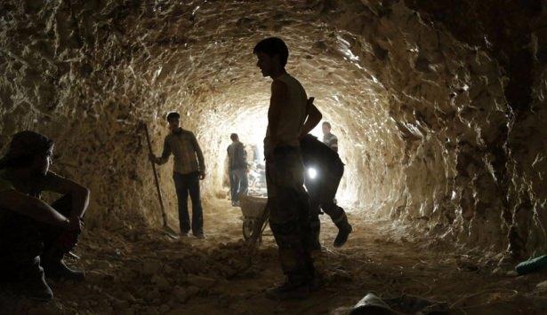 Suriye iç savaşı sırasında bombalardan korunmak için sığınak kazan muhalifler.