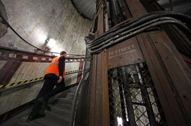 Londra'da artık kullanımda olmayan yer altı istasyonunun merdivenlerinden çıkan bir işçi.