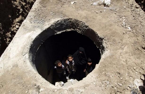Savaş sırasında evleri yıkıldığı için bir su çukurunda yaşan Yemenliler.