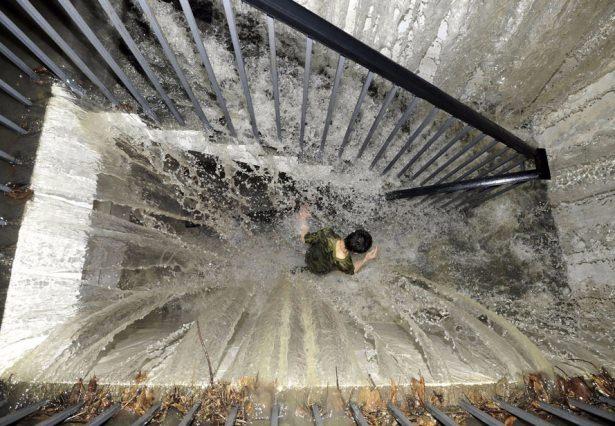 Yer altına inen merdivenlere akan su yüzünden aşağı inmekte zorlanan bir insan.