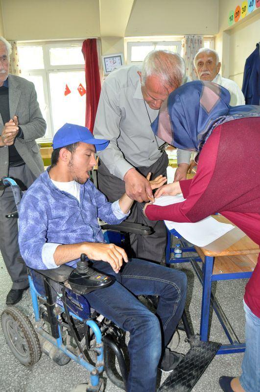 Düzce'nin Cumayeri ilçesinde fiziksel engelli Sezer Keskin, engelli annesi ile oy kullanmaya geldi