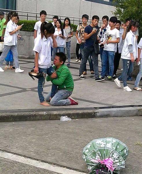 Sokak ortasında sevdiği kızın bacaklarına sarılan genç etraftakiler tarafından görüntülendi.