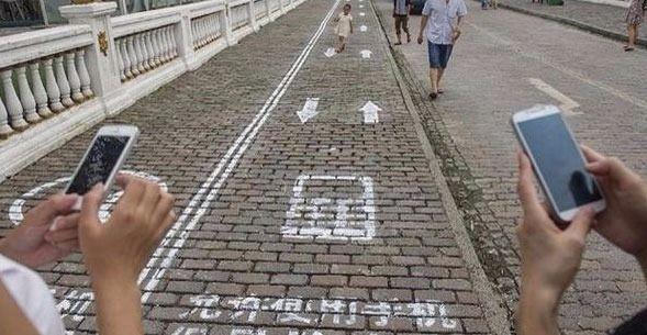 Telefon kullanıcılarının bisiklet yoluna benzeyen yoldan sapmaması için yol beyaz şeritlerle belediye tarafından ayrılmış.