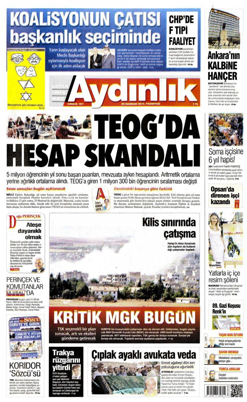 29 Haziran 2015 gazete manşetleri