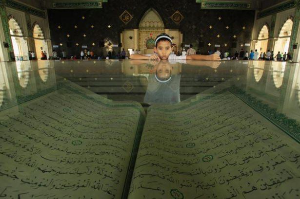 Kuran’-ı Kerim'i merakla inceleyen çocuk.