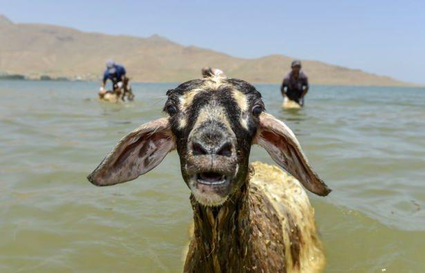 Van'ın Gevaş ilçesinde, koyun kırpma zamanı yaylalardan traktör ya da kamyonlara yüklenerek Van Gölü sahiline getirilen koyunlar, yünleri kırpılmadan önce gölün sodalı suyunda yıkanarak temizleniyor.