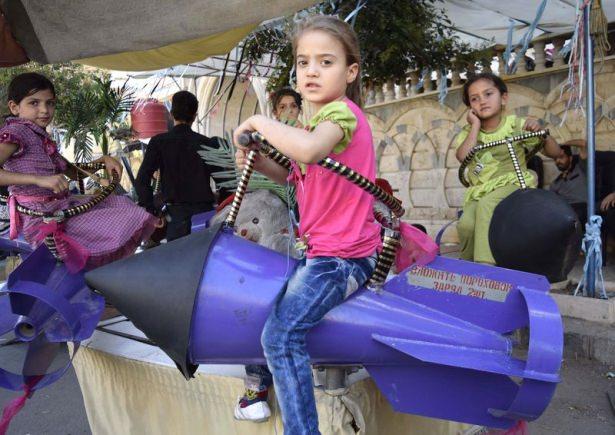 Suriye'de rejime bağlı güçlerin attığı füze, roket ve varil bombalarının parçaları, ustalar tarafından çocuklar için salıncak ve oyuncağa dönüştürüldü.