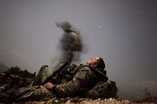 Çatışmalar arasında dinlenmeye çalışan bir ABD askeri fonda yıldızlar eşliğinde epik bir görüntü oluşturuyor.