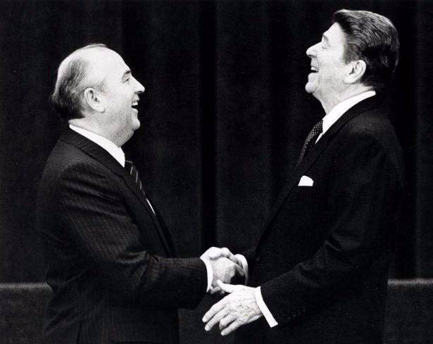 ABD Başkanı Ronald Reagan Rus Lider Mikhail Gorbaçov ile el sıkışıyor.