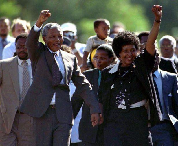 Afrika`nın efsanevi lideri Nelson Mandela 27 yıl kaldığı Victor Verster Hapishanesi`nden eşinin elini tutarak ve kendisini bekleyenleri selamlayarak çıkıyor.