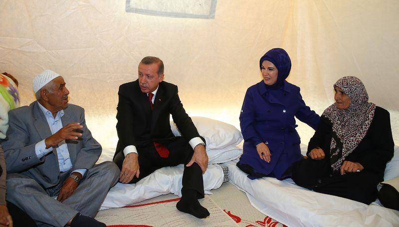 Cumhurbaşkanı Erdoğan ve eşi Emine Erdoğan, 7 Ekim 2014'te Gaziantep'in İslahiye ilçesindeki çadır kentte barınan Suriyeli sığınmacıları ziyaret etti.
