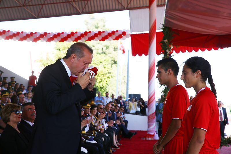 Cumhurbaşkan Erdoğan, 20 Temmuz Barış ve Özgürlük Bayramının 41. yıldönümü münasebetiyle Lefkoşa'daki Dr. Fazıl Küçük Bulvarı'nda düzenlenen törene katıldı. Cumhurbaşkanı Erdoğan, iki genç tarafından getirilen bayrakları öpüp başına koydu.