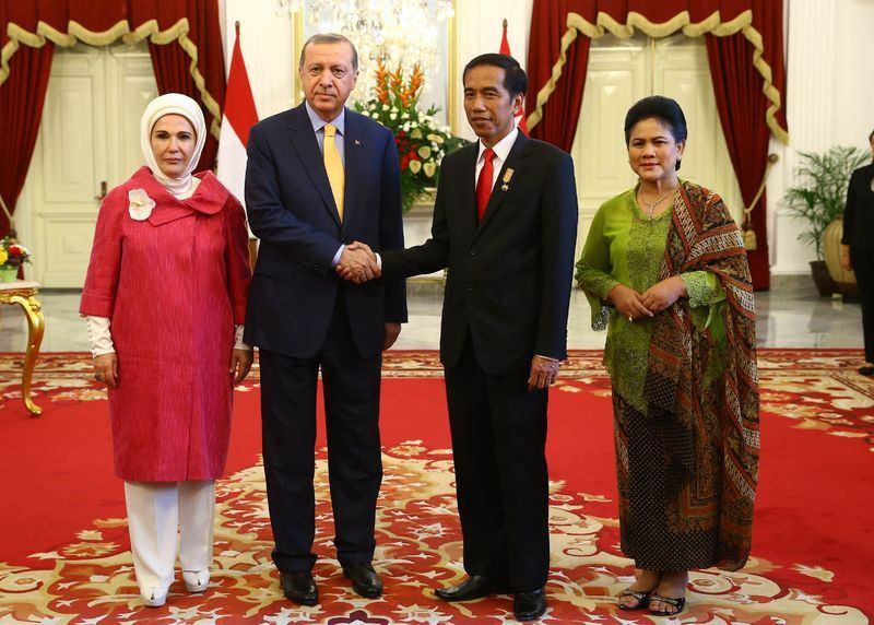 Cumhurbaşkanı Recep Tayyip Erdoğan, 31 Temmuz 2015'te Endonezya’da mevkidaşı Joko Widodo (sağ 2) tarafından Cumhurbaşkanlığı Sarayı'nda resmi törenle karşılandı. Cumhurbaşkanı Erdoğan'a eşi Emine Erdoğan (solda) da eşlik etti.