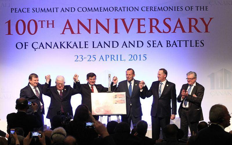 23 Nisan 2015 tarihinde Çanakkale Kara Savaşları'nın 100. yılı kapsamında İstanbul Kongre Merkezi'nde "Çanakkale 100. Yıl Barış Zirvesi Yüksek Düzeyli Oturumu" düzenlendi. Irak Cumhurbaşkanı Fuad Masum (sol 2) ,Başbakan Ahmet Davutoğlu, Avustralya Başbakanı Tony Abbott (sağ 2) ve Yeni Zelanda Başbakanı John Key (sağda), Çanakkale Savaşlarının 100. Yılı nedeniyle çıkarılan ilkgün zarfı ile basın mensuplarına poz verdi.