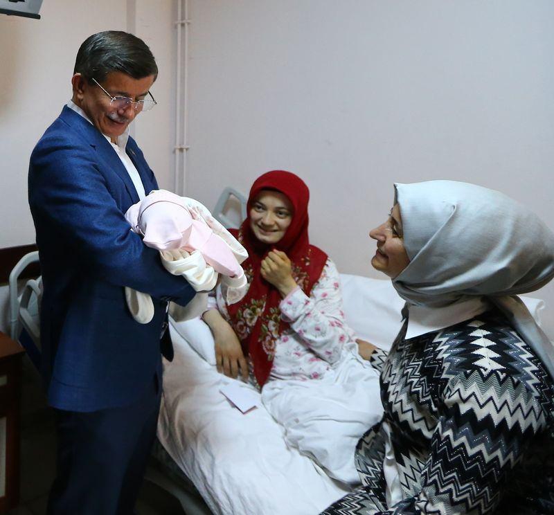Başbakan Davutoğlu'nun açıkladığı projelerden biri de en çok anne adaylarını sevindirdi. Davutoğlu, Aile Paketi kapsamında yeni doğan bebekler için annelere ilk altının devlet tarafından hediye edileceğini açıklamıştı. Davutoğlu'nun açıkladığı ve çocuk yapmayı teşvik eden aile paketine göre, her anneye doğum yaptığı anda ilk çocukta 300, 2. çocukta 400, 3. çocukta 600 TL devletten yardım ulaşacak. Fotoğrafta Başbakan Ahmet Davutoğlu ve eşi Sare Davutoğlu, 25 Mayıs 2015 Çanakkale Kadın Doğum Hastanesi'nde yaptığı ziyaret görülüyor.