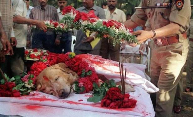 Mart 1993'te Hindistan'ın Bombay kentinde seri halinde patlamaların meydana geldiği dönemde,Labrador Retriever cinsi bir köpek (ismi zanjeer) 3 buçuk kilo patlayıcı,600 fünye,249 el bombası,6 bin 406 kurşun bularak binlerce insanın hayatını kurtardı.Hindistan'ın kahraman köpeği 2000 yılında öldüğünde,onun için büyük bir cenaze töreni düzenlendi..İşte o fotoğraf..