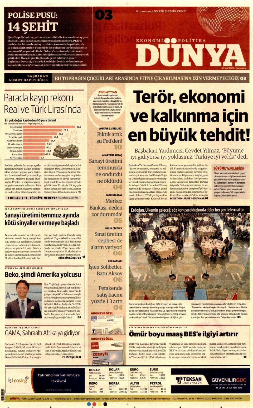 9 Eylül 2015 gazete manşetleri