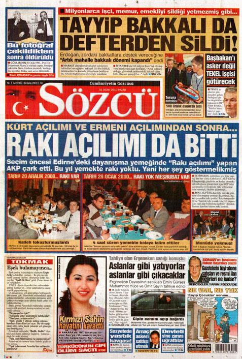 Sözcü: "İktidarın açılımları şov için yaptığı bir kez daha kanıtlandı. AKP Edirne İl Başkanlığı partinin ne kadar demokratik olduğunu göstermek için 2008'deki dayanışma yemeğinde rakı içilmesine izin vermişti. Herkes şaşırmıştı. Aynı AKP İl Başkanlığı önceki gün yine dayanışma yemeği düzenledi. Bu kez yemekte rakı yoktu. Rakı isteyenlere ise "İçeride içki yasak. İsteyen dışarıdan rakı alıp balkonda içebilir." denildi. Bunun üzerine kimse rakı içmedi."