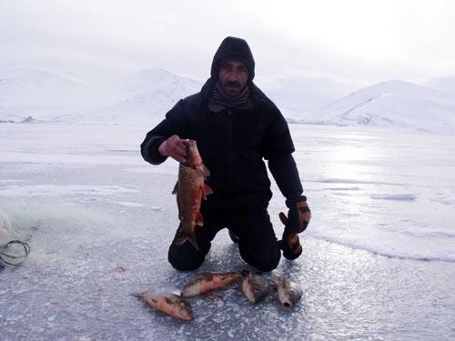 Buz kaplı Çıldır Gölü'nde balık avı/video