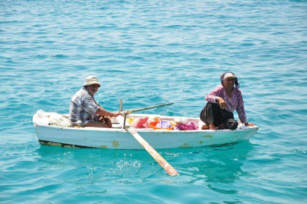 Tekne turlarına katılan yerli ve yabancı turistlere bölge halkı kendi ürettiği yöresel ürünleri satıyor...