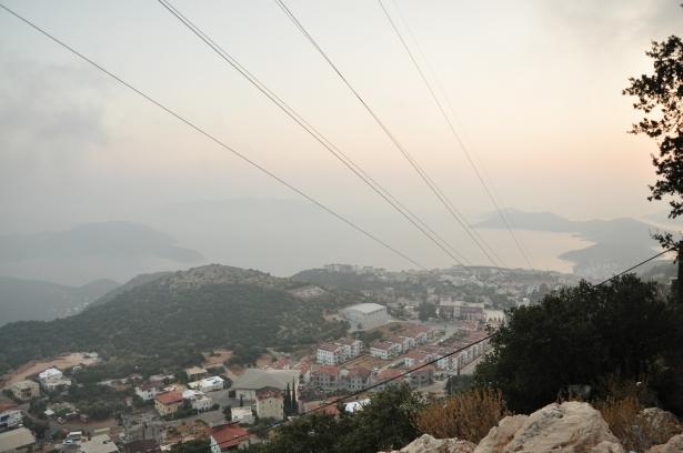 Tüm bu duraklarımızdan sonra Kaş'ın kapılarını aralıyoruz. İlk olarak dik bir vadiden kuş bakışı olarak izliyoruz Kaş'ı. Güneş batmak üzere ve Kaş üzerinde dumanımsı bir hava var. Her ne kadar görüş açımızı kısıtlasa da Kaş denize uzanan koylarıyla büyülüyor bizi.