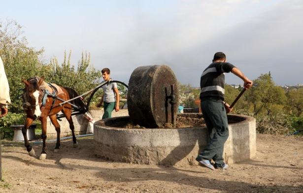 Yaklaşık 1,5 tonluk taşın, atın 3 saat aralıksız çevirmesiyle ezilen zeytin, kadınlarca sıcak suda yıkanıp sıkılarak büyük havuzlara alınıyor. Daha sonra süzdürülen zeytinyağının çekirdeği ve yağı ayrılarak şişeleniyor.