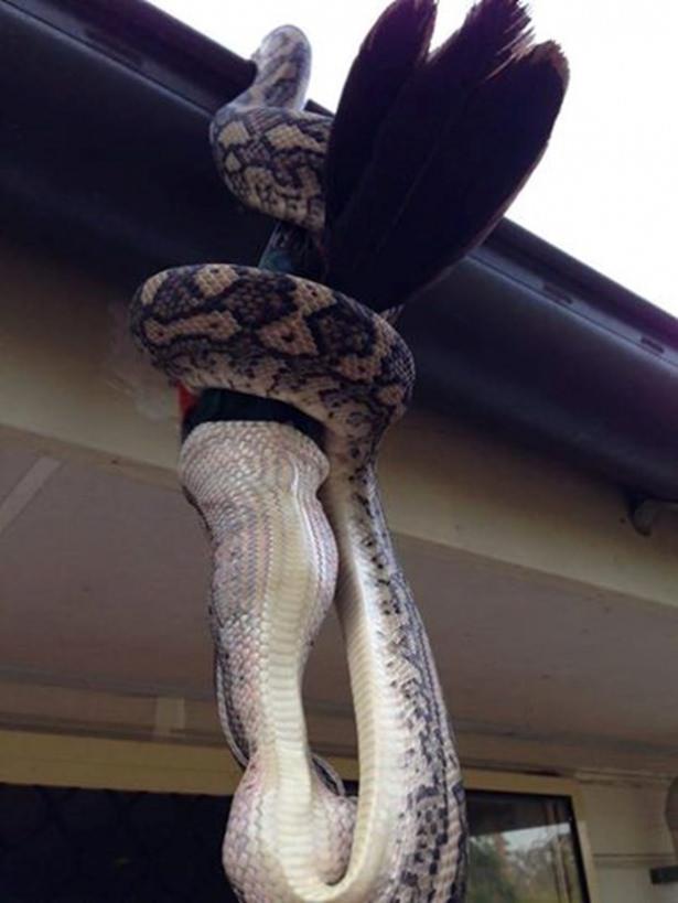 Fotoğraflarda piton yılanı, çatıya tüneyen bir papağanı canlı canlı yutarken görülüyor. Fotoğrafları paylaşan çalışan, söz konusu görüntünün ne zaman alındığı konusunda açıklama yapmadı.