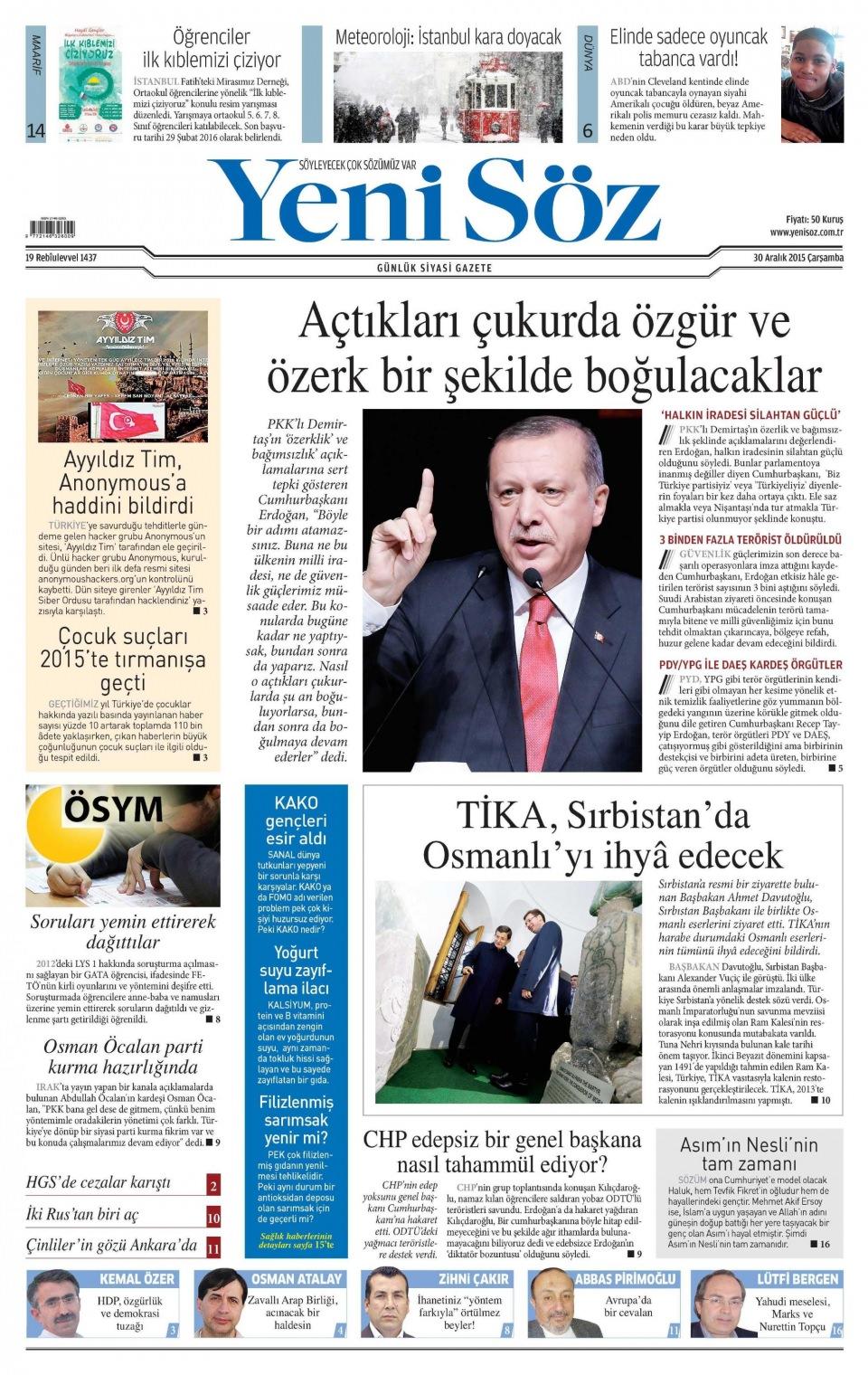 30 Aralık 2015 gazete manşetleri