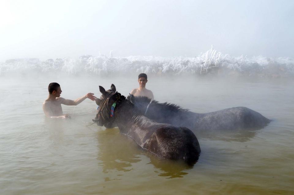Bir yanda kaplıcaya soktukları hayvanlarını yıkarken, bir yandan da atların sırtına çıkarak yaptıkları bir birinden güzel taklalarla farklı görüntüler oluşturuyorlar.