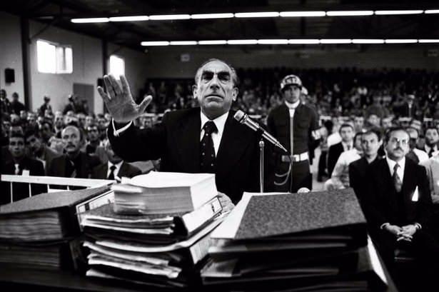 12 Eylül sonrası askeri mahkemede yargılanan Alparslan Türkeş savunmasını yapıyor,1981.