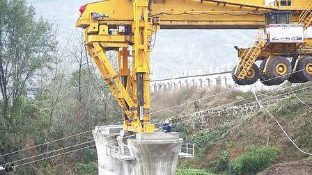Çinliler raylarında üzerinde ilerleyen bu dev makineyi kullanarak köprüyü inşa ediyor.