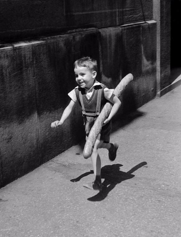 1952 yılından bu fotoğraf, küçük bir Parisli çocuğu elinde Fransızlara özgü baget ekmeği ile koşarken gösteriyor.