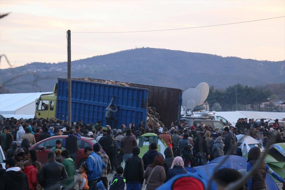 Yunanistan'ın, Makedonya sınırında sığınmacıların bulunduğu kampa odun getiren kamyonun önünde izdiham oluştu.
