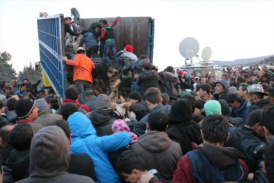 Makedonya'ya girmek için sınırdaki kampta bekleyişleri süren çok sayıdaki sığınmacı, odunlardan alabilmek için birbiriyle yarıştı.