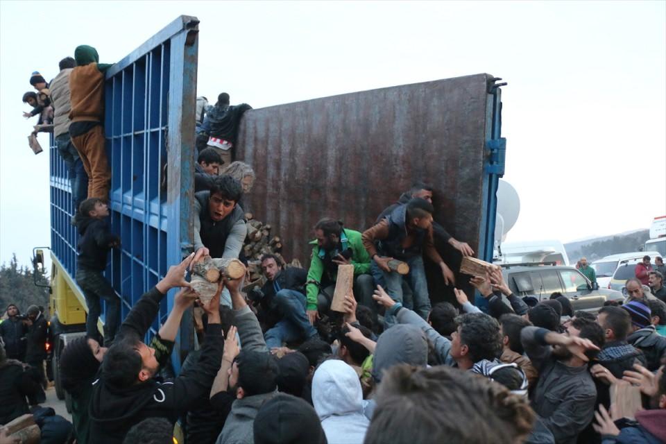 Odunları taşıyan kamyonun önünü kesen sığınmacılar izdihama sebep oldu.