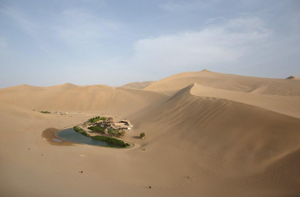 Çin'in ortasınnda uçsuz bucaksız kum tepeleri arasında bir vaha.