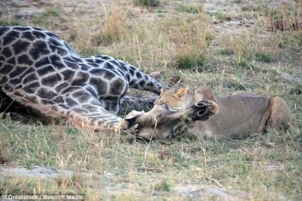 Aslanlardan kurtulmak için her yolu deneyen zürafa sonunda pes ediyor.