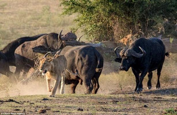 İşte bu aslanlar da, bir buffalo sürüsünün ortasında tek başına kaldığında, başlarına neler gelebileceğini çok iyi bilen iki kral.