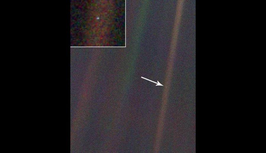 Dünya'nın en uzaktan çekilmiş fotoğrafı, yaklaşık 6 milyar kilometre öteden çekilmiştir ve Soluk Mavi Nokta olarak bilinir.