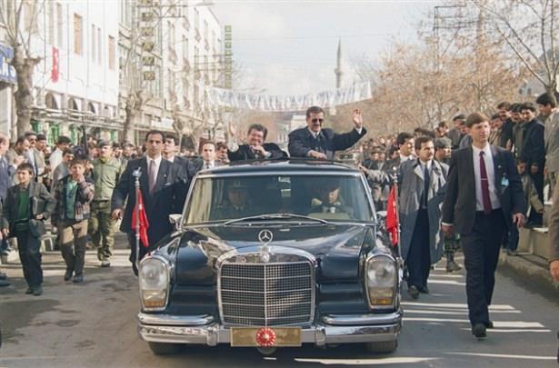 Cumhurbaşkanı Turgut Özal ve Devlet Bakanı Mehmet Keçeciler 17 Aralık 1990'da Konya gezisi sırasında vatandaşları selamlarken görülüyor.