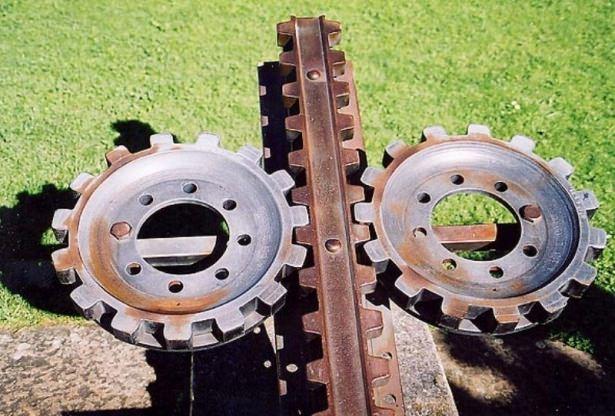 İki yatay dişli çarkla dönen bir dişli ray tasarladı. Tekerleklerin dimdik yukarıya çıkışlarda kopmaması için altlarına yuvarlak bir disk monte etti.
