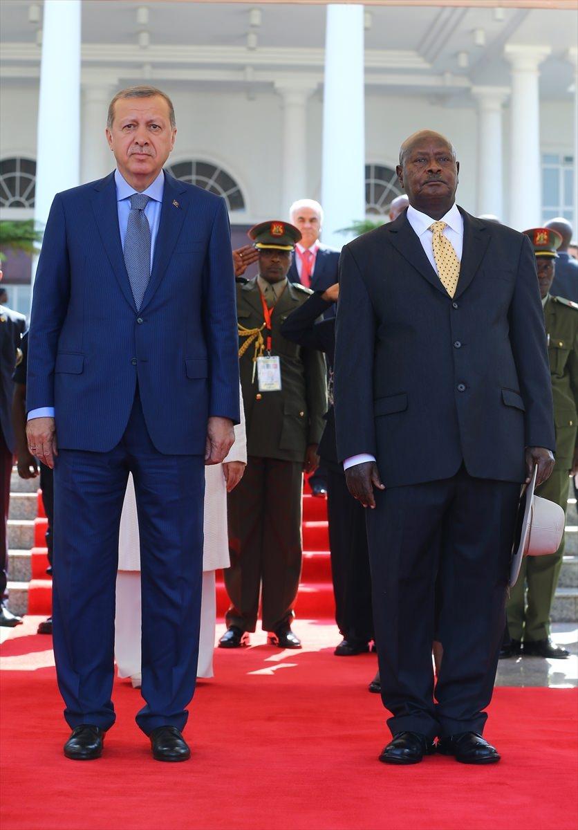 Cumhurbaşkanı Recep Tayyip Erdoğan, resmi bir ziyaret için geldiği Uganda'da, Cumhurbaşkanı Yoweri Museveni tarafından resmi törenle karşılandı.