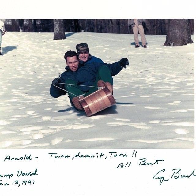 Arnold Schwarzenegger ve arkasındaki Başkan George Bush, kızak kayarken, 1991