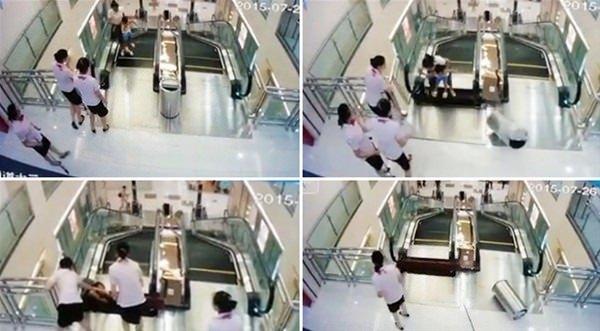 Çin’de az daha bir yürüyen merdiven faciası daha yaşanıyordu. Çocuğunu son anda kurtaran ama kendisini kurtaramayan kadının başına gelenler, bu kez bir mediven bakımı yapan teknisyenin başına geliyordu.