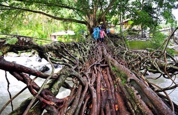 Endonezya'da ağaç köklerinden yapılmış bir köprü