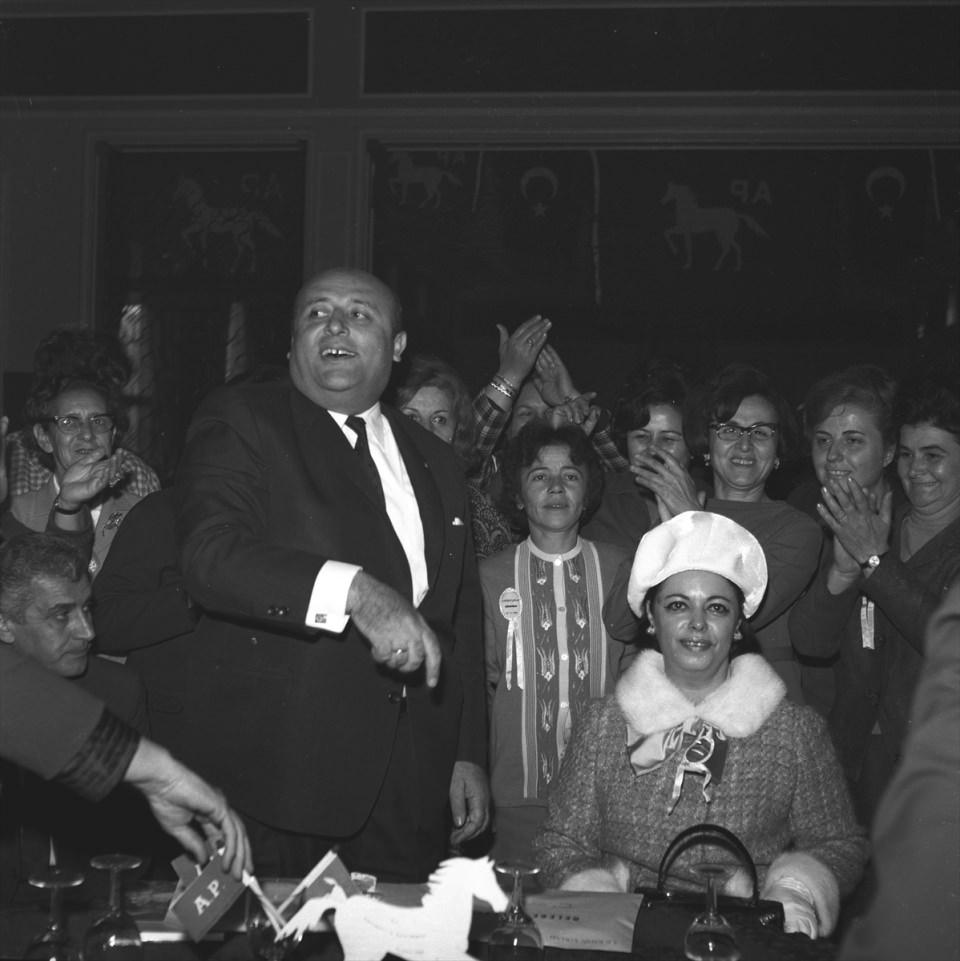 Adalet Partisi (AP) Genel Başkanı Demirel ve eşi Nazmiye Demirel, 30 Ekim 1966'da partisinin Kadın Kolları Genel Kongresi'nde görülüyor.